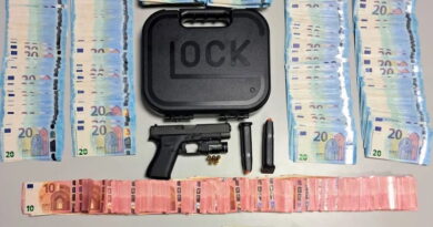 Foi efectuada uma busca domiciliária, que resultou na apreensão de 209,7 doses de resina de canábis; 62,3 doses de MDMA; 46,8 doses de heroína; 24,2 doses de cocaína; 241 maços de tabaco; 3 318,54 euros em numerário; duas facas utilizadas no corte do produto estupefaciente; uma arma de ar comprimido; uma arma de caça submarina; sete telemóveis e duas balanças de precisão.