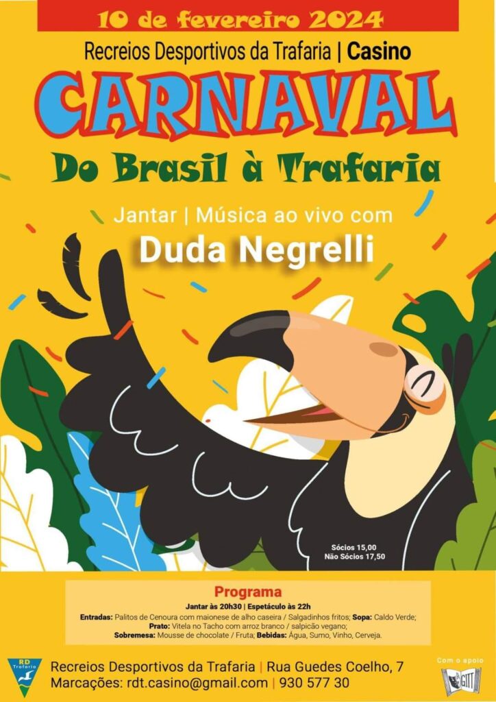 O Casino da Trafaria, datado de 1906, acolhe no dia 10 de Fevereiro o “Carnaval do Brasil à Trafaria, que consiste em jantar às 20h30 e espectáculo de música ao vivo com Duda Negrelli às 22h. Pode ver a ementa do jantar no cartaz abaixo. A entrada tcusta 15€ para sócios e 17.50€ para não sócios. A organização é do clube Recreios Desportivos da Trafaria, fundado em 1940 e, as reservas podem ser feitas para o mail rdt.casino@gmail.com ou para o telefone 930 577 301 ou 212 950 526.