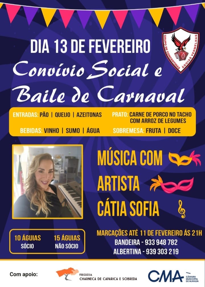 O GCAV – Associação Grupo de Concertinas Águias Vermelhas da Charneca de Caparica, organiza um “Convívio Social e Baile de Carnaval”, no dia 13 de Fevereiro a partir das 21h, na sua sede na Rua João de Deus, n° 14. O evento engloba jantar, cuja ementa pode ver no cartaz abaixo e, animação musical com a artista Cátia Sofia. O valor é de 10 águias para sócios e 15 águias para não sócios. As marcações devem ser feitas até dia 11 às 21h, para os números de telefone do Bandeira 933 948 782, ou da Albertina 939 303 219. O evento conta com o apoio da Junta de Freguesia da Charneca da Caparica e Sobreda (JFCCS) e da Câmara Municipal de Almada (CMA)