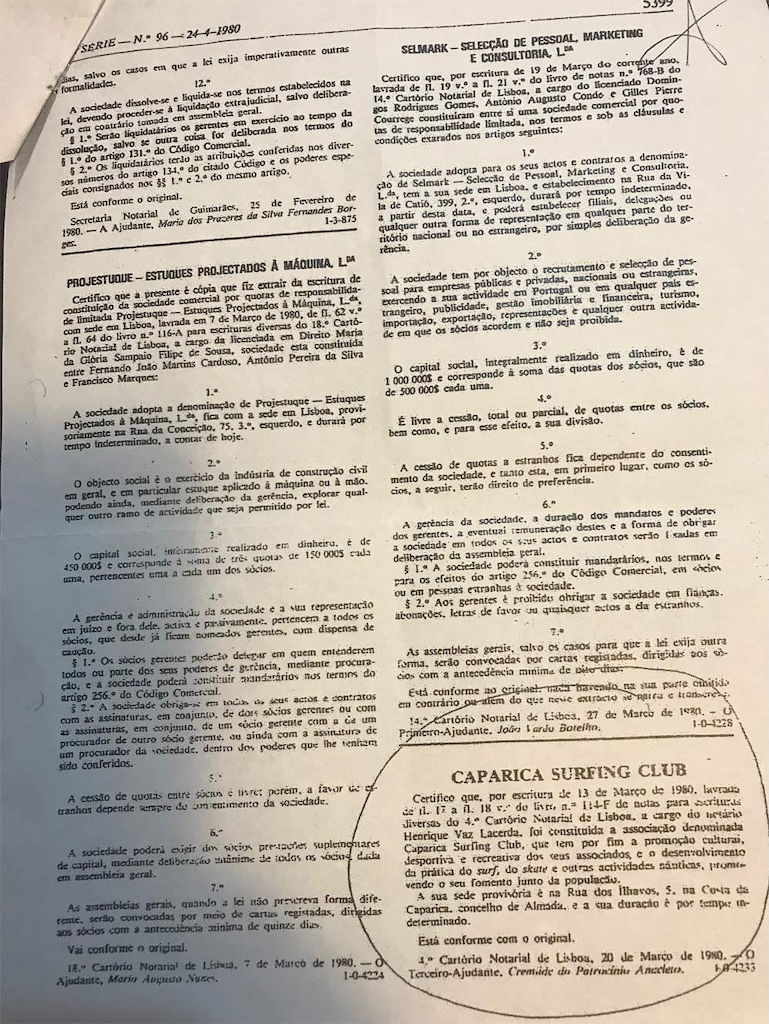 Decreto-Lei 94/1980, onde foi publicado a fundação do Caparica Surfing Club.