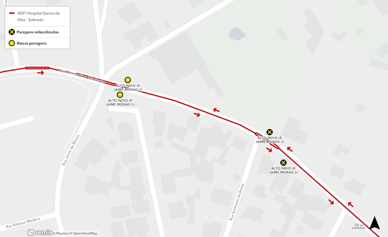A linha 3027 | Pragal (Estação) – Sobreda, via Hospital Garcia de Orta, terá as paragens Alto Índio (R Jaime Morais 3), em ambos os sentidos, relocalizadas. Veja a nova localização das paragens no mapa abaixo.
