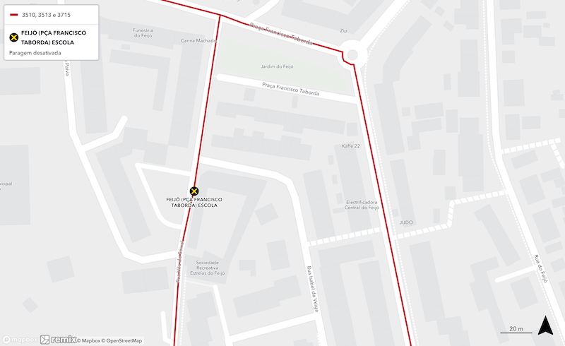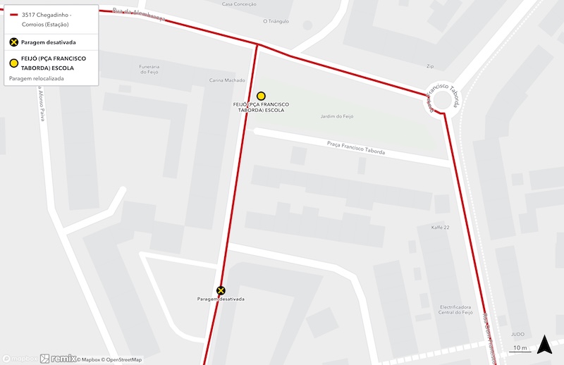A linha 3517 | Chegadinho – Corroios (Estação) terá a paragem Feijó Escola (Praça Francisco Taborda) relocalizada para a frente da praça Jardim do Feijó, por motivos de segurança dos passageiros. Veja a localização da nova paragem no mapa abaixo.