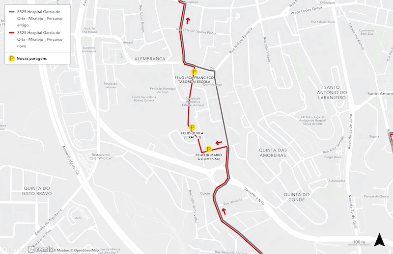 A linha 3525 | Hospital Garcia de Orta – Miratejo, terá ajuste de percurso no sentido Hospital Garcia de Orta. A linha passa a fazer o seu percurso pela Rua Vila do Seixal, e contará com 3 novas paragens: Feijó (R Vila Seixal 13), Feijó Escola (Pça Francisco Taborda) e Feijó (R Mário A Gomes 64). Veja o mapa com o novo percurso e paragens abaixo.