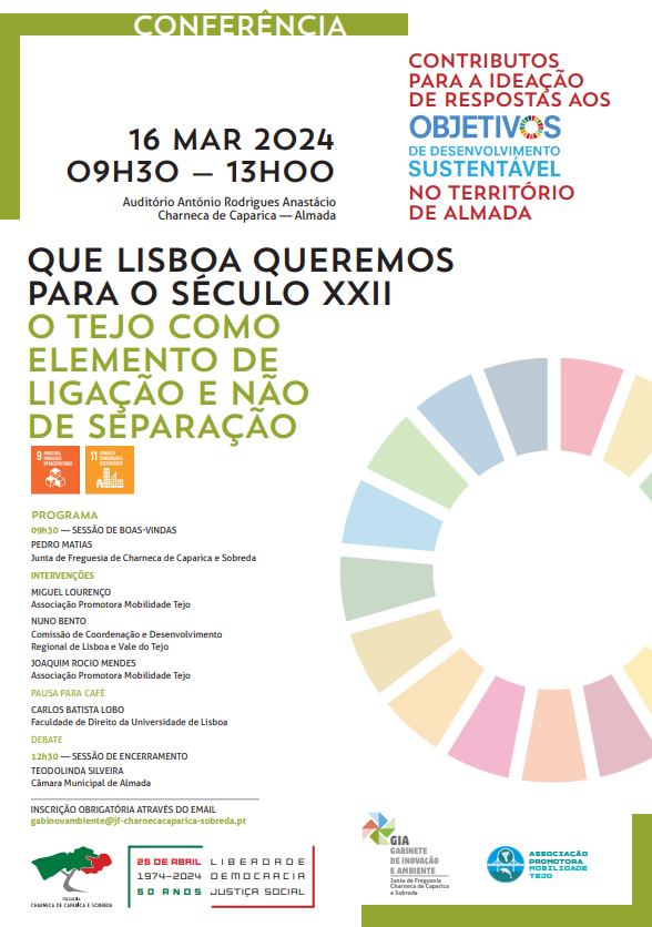 No dia 16 de Março, entre as 9h30 e as 13h, realiza-se no Auditório António Rodrigues Anastácio, no edifício da Junta de Freguesia da Charneca de Caparica e Sobreda, a conferência “Que Lisboa queremos para o século XXII – O Tejo como elemento de ligação e não de separação.”