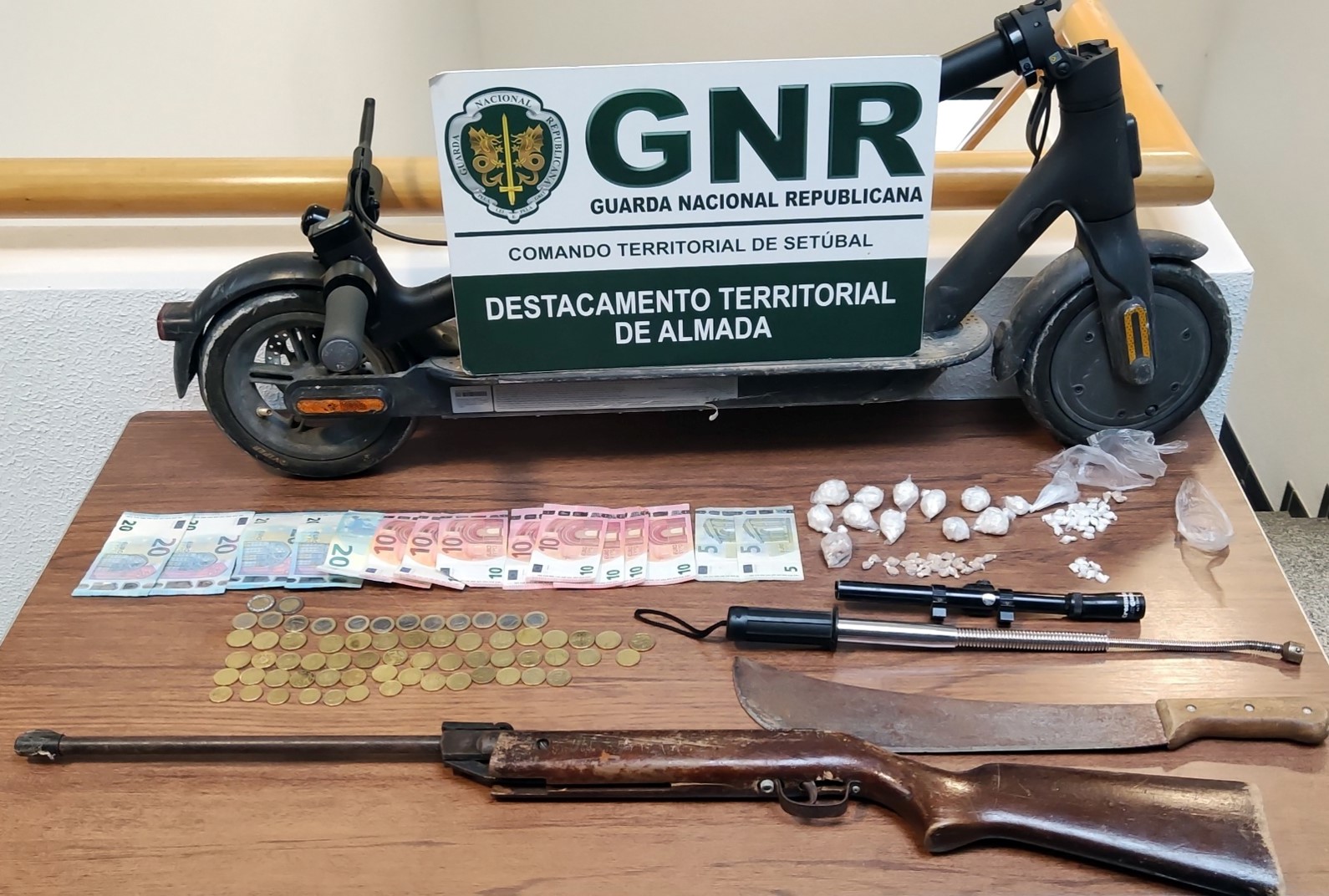 No decorrer de uma acção de patrulhamento os militares da GNR abordaram dois homens, sendo que durante a fiscalização foi possível verificar que um deles tinha producto estupefaciente na sua posse. No seguimento das diligências policiais, foi realizada uma busca domiciliária onde foi possível apreender o seguinte: 290 doses crack; 120 doses de heroína; uma trotinete eléctrica; uma catana; um bastão extensível; uma mira telescópica; uma pressão de ar e ; 210 euros em numerário.