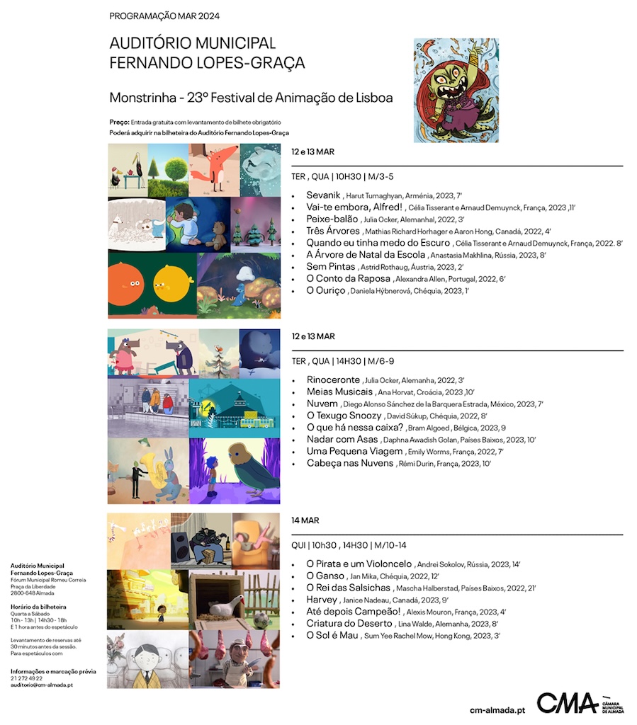 A Monstrinha está de regresso a Almada com sessões de cinema dedicadas ao público infantil e às famílias. Tudo acontece no Auditório Municipal Fernando-Lopes Graça, de 12 a 14 de Março. A entrada é livre, mediante levantamento de bilhete obrigatório.