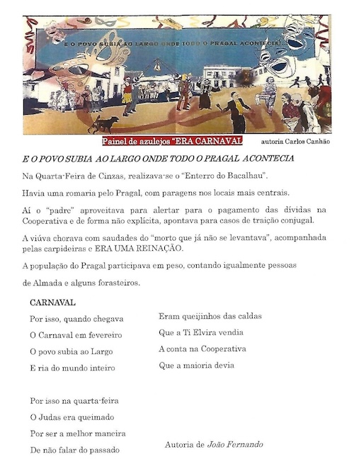 O painel azulejar “Era Carnaval”, do artista Carlos Canhão, foi inaugurado a 31 de Outubro, no Largo 25 de Abril, no Pragal. Além deste painel, o pintor tem mais dois outros painéis nesta freguesia, no Forno de Cima – Praia dos Tesos e Azulejos de Vida, que também enaltecem a memória colectiva das suas gentes.
