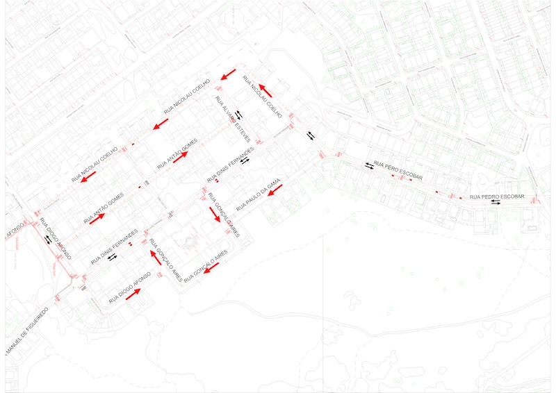 Os arruamentos passarão a ter sentidos únicos de circulação são a Rua Nicolau Coelho, Rua Antão Gomes, Rua Gonçalo Aires Rua Diogo Afonso e Rua Paulo da Gama
