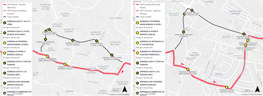 Nas linhas 3510 Cacilhas (Terminal) – Pilotos e 3515 Corroios – Caparica (Pilotos), no sentido Cacilhas e Corroios, o percurso alternativo passará pela Rua Petrónio Amor de Barros e Rua do Povo. No sentido Pilotos e Caparica, passará pela Rua Petrónio Amor de Barros e Rua Qta. do Salgado.
