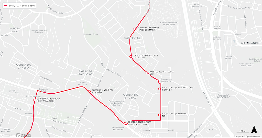 As linhas 3017 Charneca da Caparica – Pragal (Estação), 3023 Costa da Caparica (Terminal) – Laranjeiro, 3041 Cacilhas (Terminal) – Caparica (Pilotos) e 3504 Hospital Garcia de Orta – Quintinhas, passarão pela R. Vale de Flores.