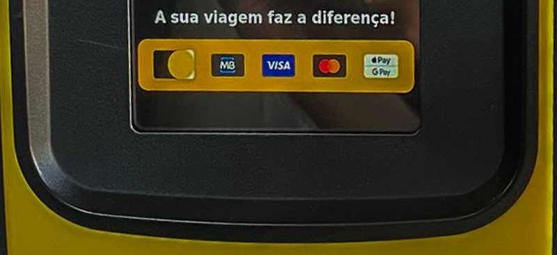 Para saber se a sua linha aceita este tipo de pagamento, basta verificar se o ecrã do validador apresenta a faixa amarela com os ícones de Multibanco, VISA, MasterCard e Apple Pay, Google Pay, como na imagem abaixo.